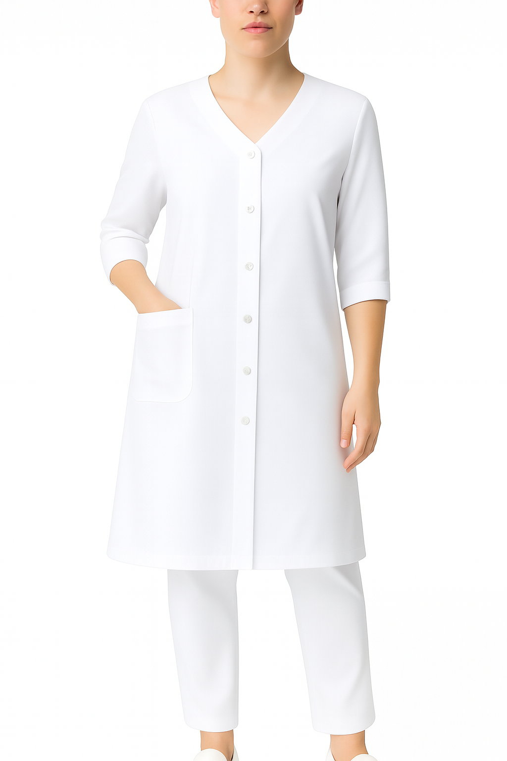 Dieser Damen Laborkittel in Weiß ist die perfekte Berufskleidung für Medizin, Pflege, Labor und Pharmazie. Mit einem modernen V-Ausschnitt, der praktischen Druckknopfleiste und der Möglichkeit, die Ärmel hochzukrempeln, vereint er Funktionalität und Stil.